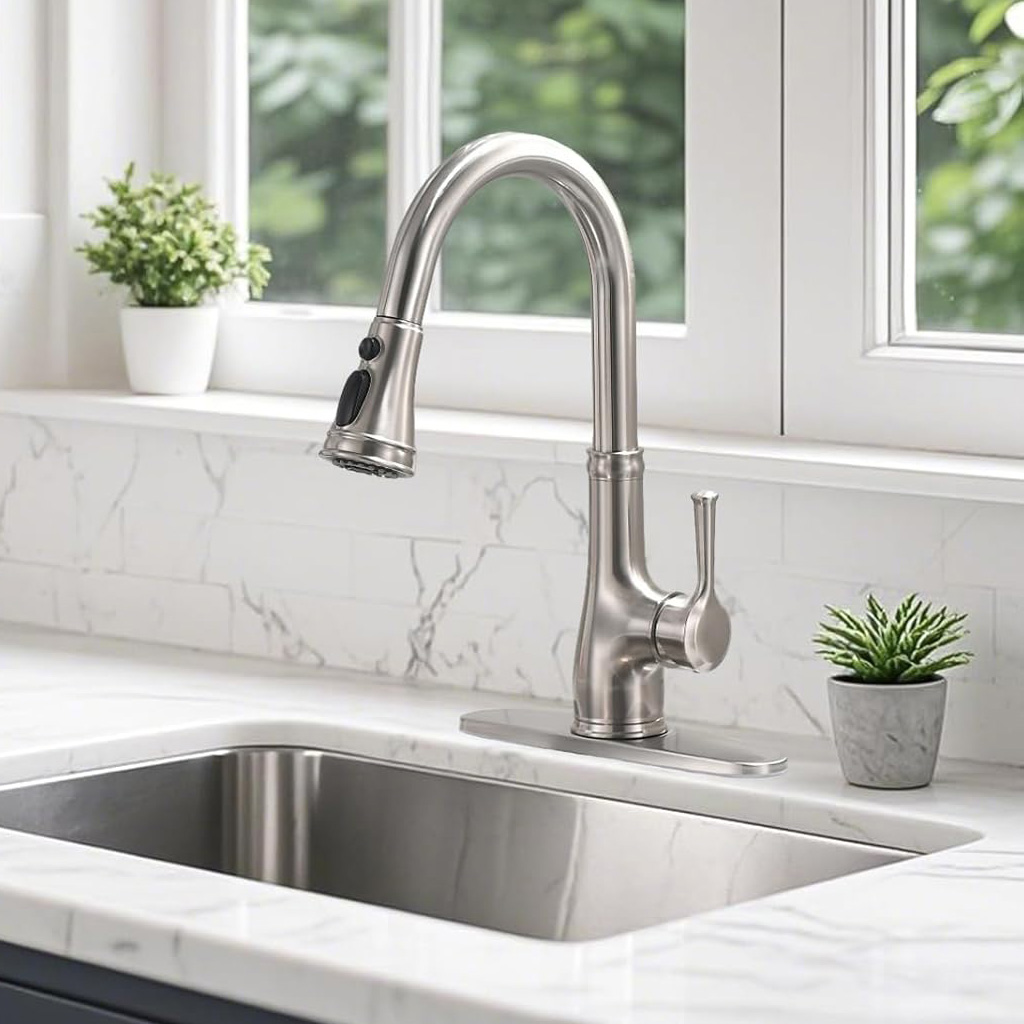 Tulip-inspired simplicity meets flexible performance. Features three spray modes (stream, spray, pause), a 360° swivel spout, and pre-installed hoses for lightning-fast installation. Brushed nickel finish resists water spots and wipes clean with ease.